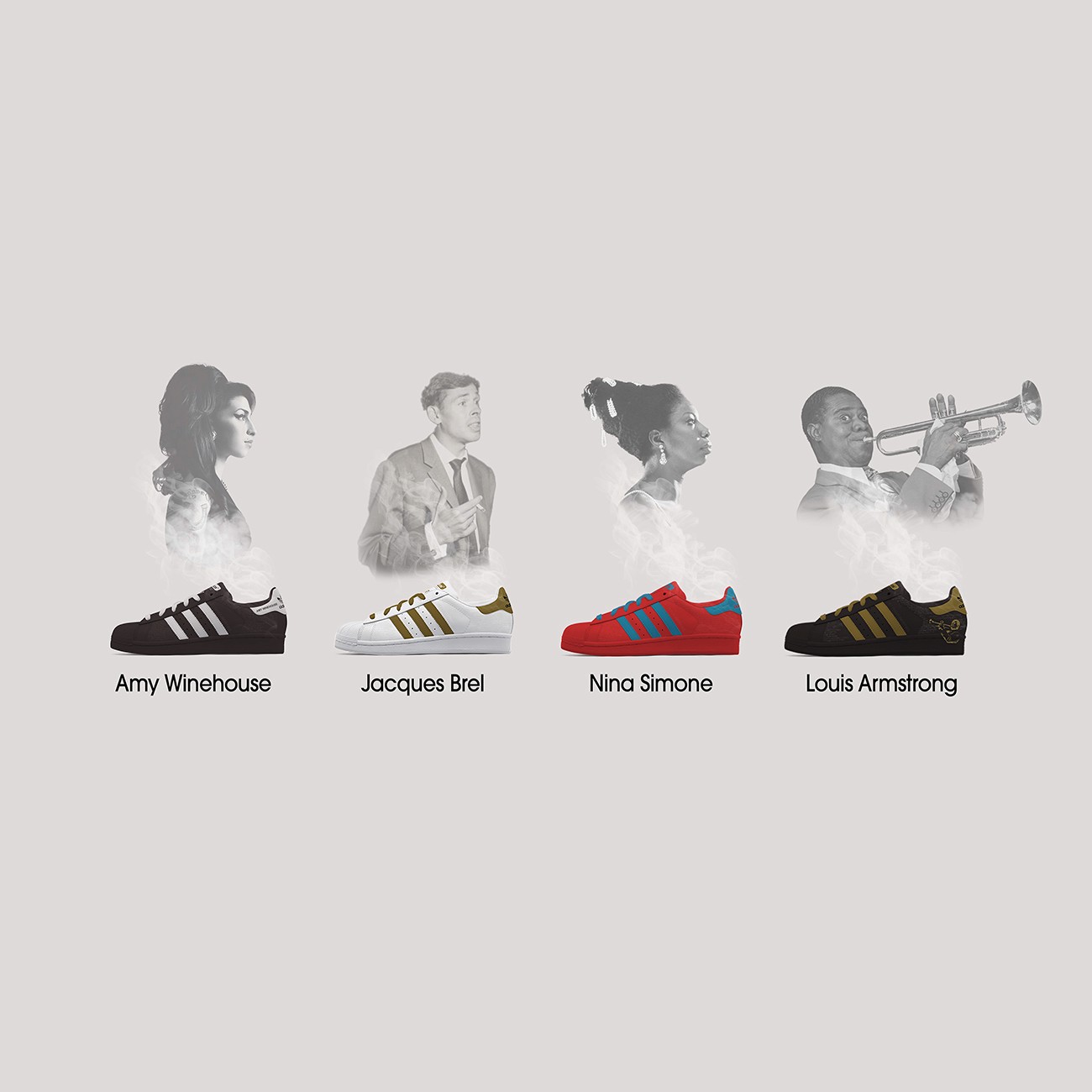 Étant un grand fan de musique, j’ai également créé des visuels pour des musiciens dont j'apprécie grandement le travail : Amy Winehouse, Jacques Brel, Nina Simone et Louis Armstrong. Le design de ces modèles est basique, une couleur de base pour la chaussure et une autre sur les bandes pour faire ressortir des éléments par rapport au fond. Sur chacune des chaussures, on peut retrouver le nom des chansons des différents artistes écrits en relief afin de donner une texture originale à chaque chaussure.