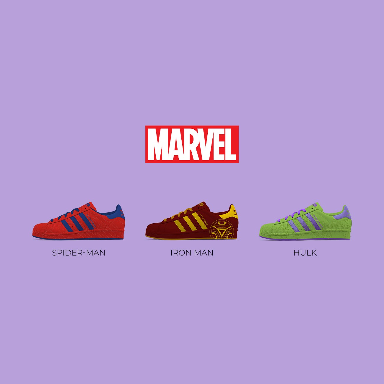 Il existe de nombreux super-héros dans l'univers MARVEL, c’est pour cela que j’ai choisi les personnages les plus connus : Spider-man, Iron Man et Hulk. Pour symboliser ces personnages, j’ai repris des caractéristiques propres à chacun. Une toile d’araignée creusée dans la chaussure pour Spider-Man, le réacteur «Arc» pour Iron Man et des veines, représentant la force, pour Hulk.